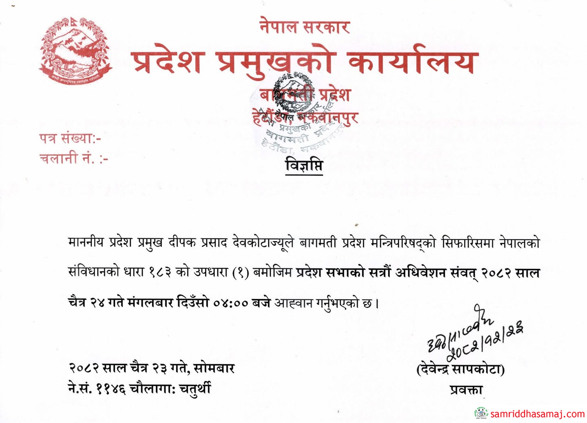 हेटौँडा : बागमती प्रदेशसभाको हिउँदे अधिवेशन चैत २४ गतेका लागि आव्हान भएको छ । प्रदेश सरकारको सिफारिसमा प्रदेश प्रमुख दीपक प्रसाद देवकोटाले प्रदेश सभाको अधिवेशन आव्हान गर्नुभएको हो ।
