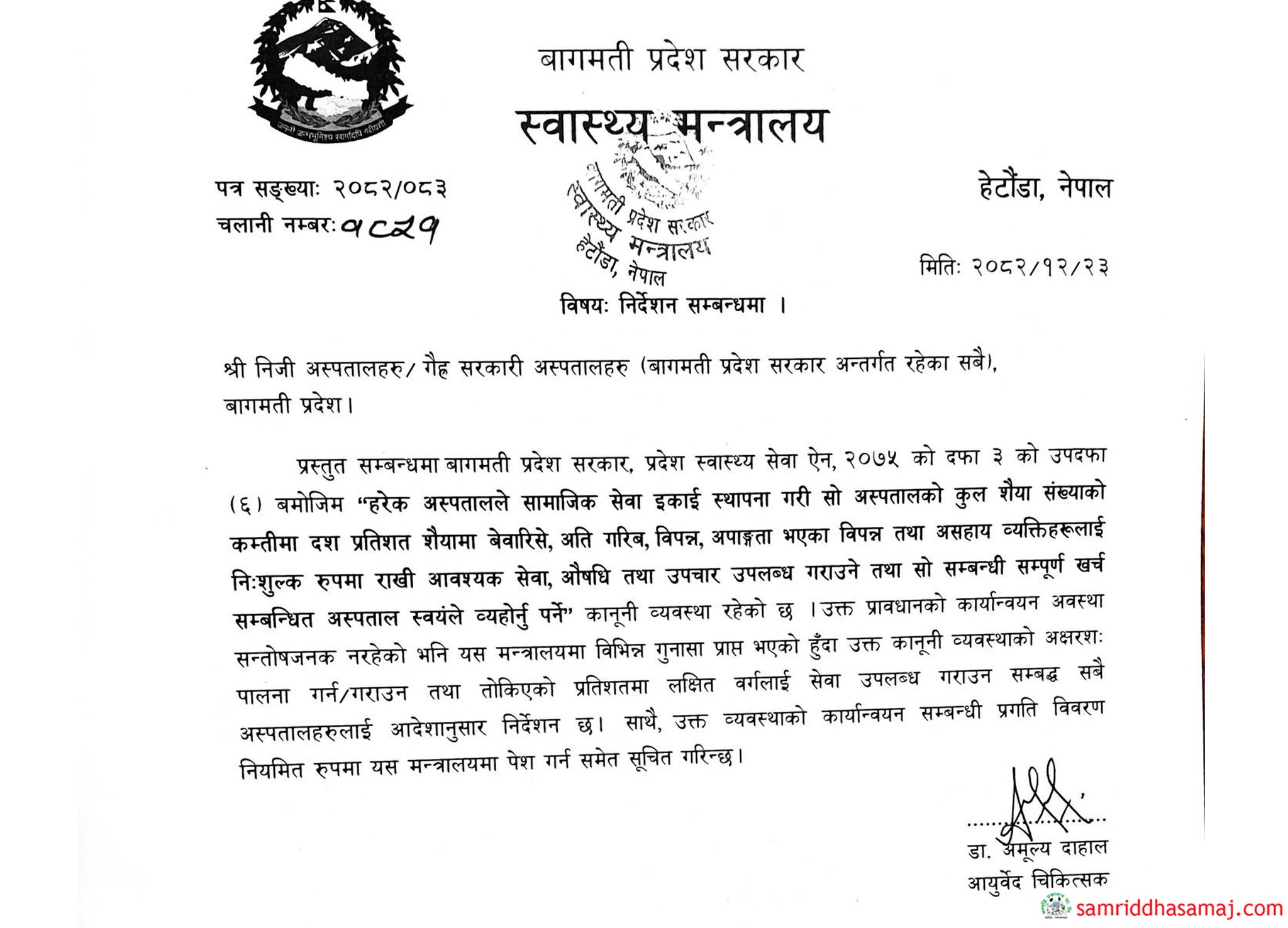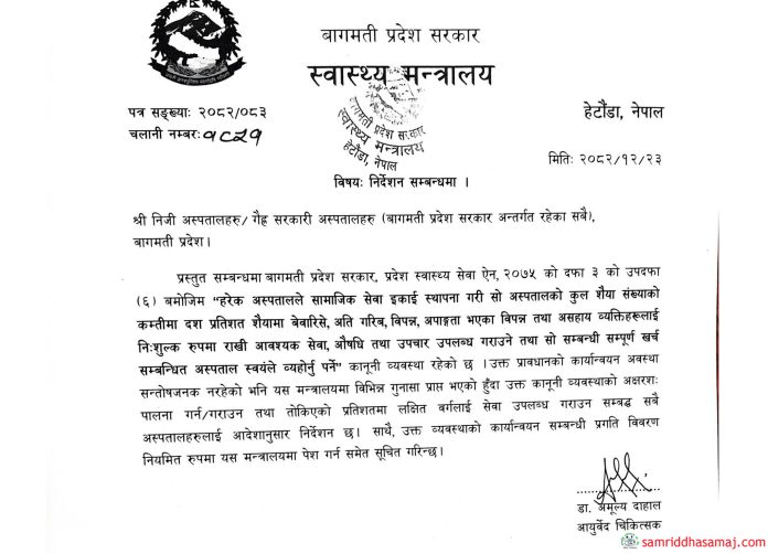 मन्त्रालयले सोमबार एक परिपत्र जारी गर्दै बागमती प्रदेश स्वास्थ्य सेवा ऐन, २०७५ को दफा ३ को उपदफा (६) मा भएको कानुनी व्यवस्थालाई अक्षरशः पालना गर्न निर्देशन दिएको हो । उक्त ऐनमा हरेक अस्पतालले सामाजिक सेवा इकाई स्थापना गरी अस्पतालको कुल शैय्या संख्याको कम्तीमा १० प्रतिशत शैय्यामा बेवारिसे, अति गरिब, विपन्न, अपाङ्गता भएका र असहाय व्यक्तिहरुलाई निःशुल्क उपचार सेवा दिनुपर्ने प्रावधान छ । सो अन्तर्गत लक्षित वर्गलाई आवश्यक सेवा, औषधि तथा उपचार उपलब्ध गराउँदा लाग्ने सम्पूर्ण खर्च सम्बन्धित अस्पताल स्वयम्ले व्यहोर्नुपर्नेछ ।
