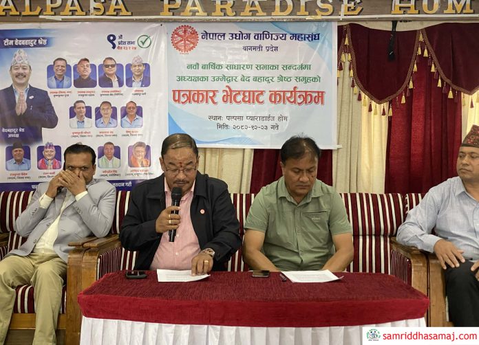हेटौँडा : नेपाल उद्योग वाणिज्य महासंघ बागमती प्रदेश समिति अध्यक्षका लागि वेद बहादुर श्रेष्ठले उम्मेदवारी घोषणा गरेका छन् । हेटौंडामा सोमबार बिहान पत्रकार सम्मेलन मार्फत् श्रेष्ठले उम्मेदवारी घोषणा गरेका हुन् । प्यानलसहित उम्मेदवारी घोषणा गरेका श्रेष्ठले ९ बुँदे प्रतिवद्धता समेत सार्वजनिक गरेका छन् । सोमबारबाटै साधारणसभा सुरु भएको छ भने निर्वाचनको कार्यक्रम मंगलबार हुनेछ ।