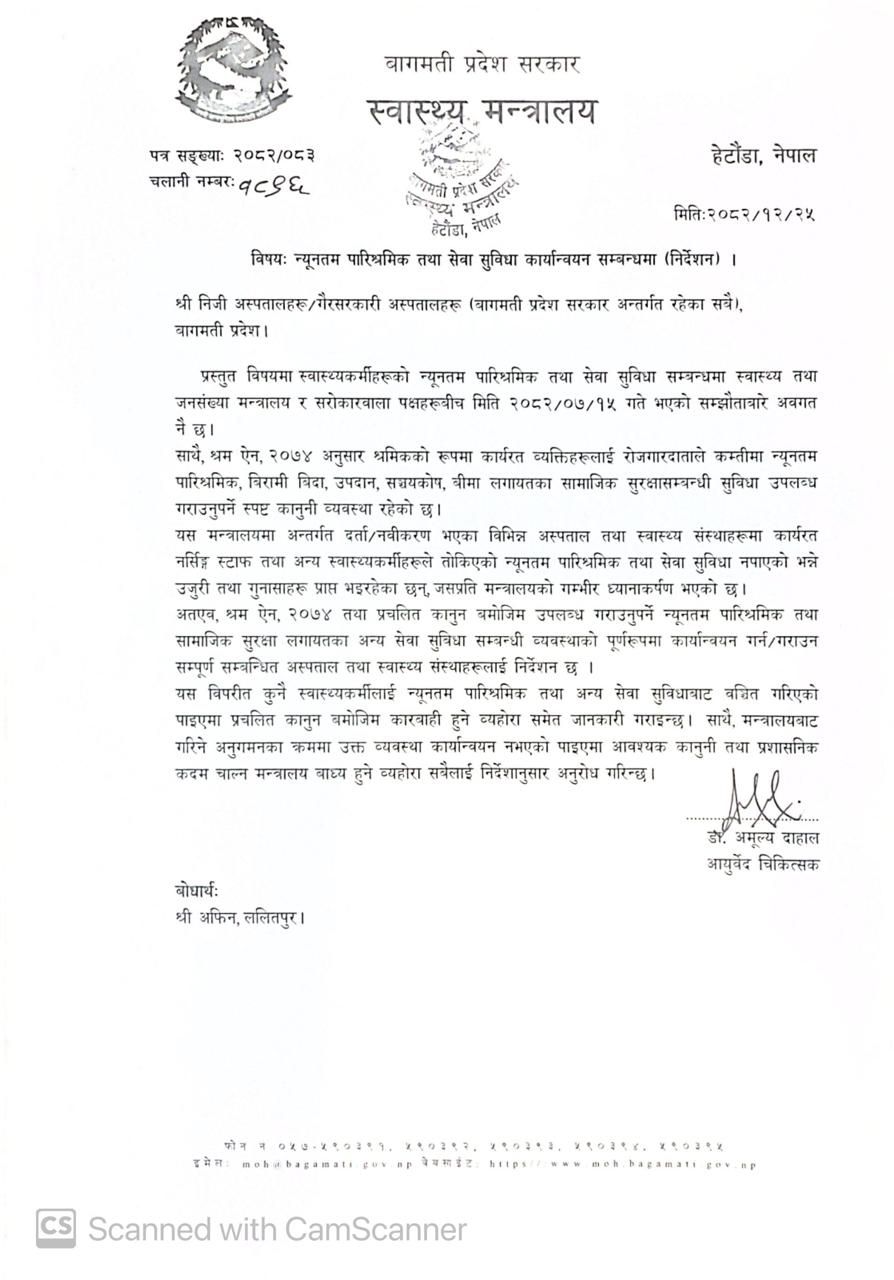 यसअघि स्वास्थ्य तथा जनसंख्या मन्त्रालय र सरोकारवाला पक्षहरुबीच २०८२ कात्तिक १५ मा भएको सम्झौतालाई समेत पूर्णरुपमा पालना गर्न निर्देशन दिइएको हो । कुनै स्वास्थ्यकर्मीलाई न्यूनतम पारिश्रमिक र अन्य सेवा सुविधाबाट वञ्चित गरिएको पाइएमा प्रचलित कानुन बमोजिम कारबाही हुने मन्त्रालयले चेतावनी समेत दिएको छ । मन्त्रालयले अस्पतालहरुको नियमित अनुगमन गर्ने र सो क्रममा तोकिएको व्यवस्था कार्यान्वयन नभएको पाइएमा आवश्यक कानुनी तथा प्रशासनिक कदम चाल्न मन्त्रालय बाध्य हुने जनाएको छ ।