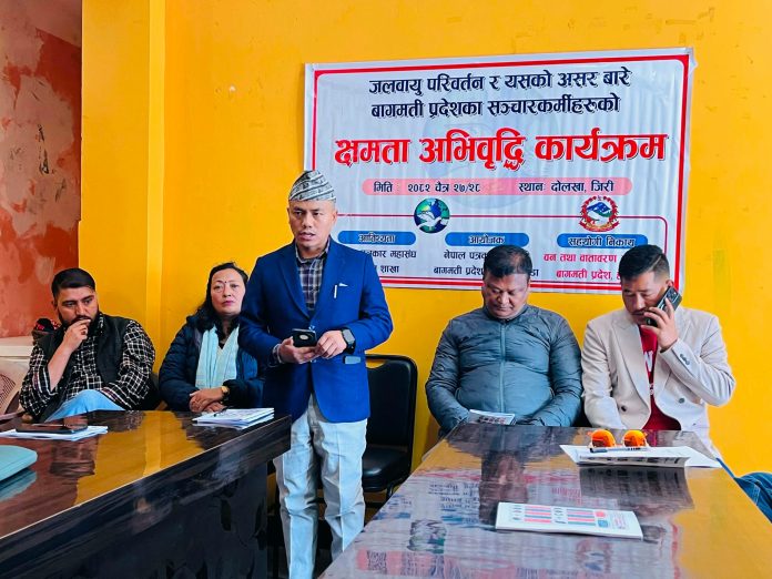 जलवायु परिवर्तन र यसको असरबारे सञ्चारकर्मीको क्षमता अभिवृद्धि कार्यक्रम बागमती प्रदेश सरकारको वन तथा वातावरण मन्त्रालय तथा नेपाल पत्रकार महासंघ बागमती प्रदेश समितिको संयुक्त आयोजनामा ‘जलवायु परिवर्तन र यसको प्रभाव’ विषयक सञ्चारकर्मी क्षमता अभिवृद्धि कार्यक्रम दोलखा जिल्लाको जिरीमा सुरु भएको छ । जलवायु परिवर्तन जस्तो संवेदनशील र विश्वव्यापी चुनौतीबारे सही सूचना प्रवाहमा सञ्चारकर्मीको भूमिका प्रभावकारी बनाउने उद्देश्यले कार्यक्रम आयोजना गरिएको हो । शुक्रबार र शनिबार दुई दिन सञ्चालन हुने कार्यक्रममा बागमती प्रदेशका विभिन्न जिल्लाका ४० जना सञ्चारकर्मीको सहभागिता रहेको छ । कार्यक्रममा जलवायु परिवर्तनका कारण, प्रभाव, जोखिम न्यूनीकरणका उपाय तथा सञ्चारमाध्यमले खेल्न सक्ने भूमिकाबारे विस्तृत छलफल र प्रशिक्षण प्रदान गरिने छ ।