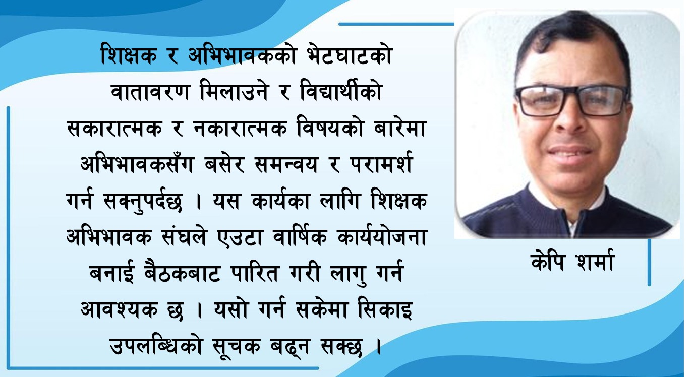 २. शिक्षक अभिभावक संघ : विद्यालयको सिकाई उपलब्धि बढाउन र शिक्षकहरुको नवप्रर्वतनलाई प्रोत्साहन गर्ने शिक्षक अभिभावक संघको महत्वपूर्ण भूमिका रहन्छ । शिक्षक र अभिभावक बीचको पुलको काम पनि यस संघले गर्नुपर्ने हुन्छ । शिक्षक र अभिभावकको भेटघाटको वातावरण मिलाउने र विद्यार्थीको सकारात्मक र नकारात्मक विषयको बारेमा अभिभावकसँग बसेर समन्वय र परामर्श गर्न सक्नुपर्दछ । यस कार्यका लागि शिक्षक अभिभावक संघले एउटा वार्षिक कार्ययोजना बनाई बैठकबाट पारित गरी लागु गर्न आवश्यक छ । यसो गर्न सकेमा सिकाइ उपलब्धिको सूचक बढ्न सक्छ ।