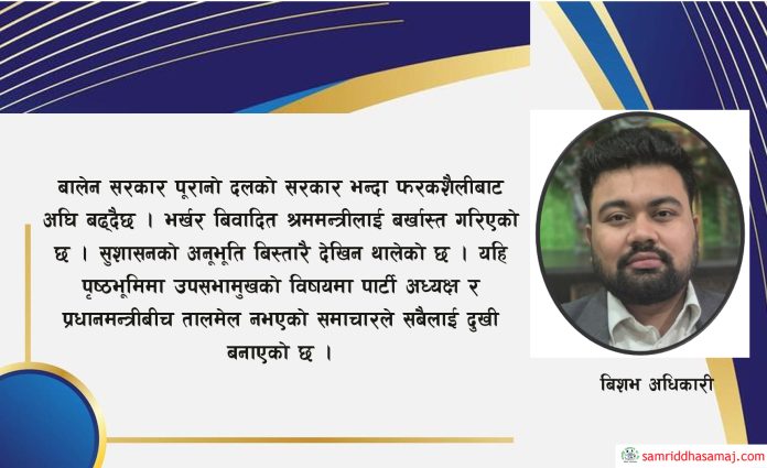 बालेन सरकार पूरानो दलको सरकार भन्दा फरकशैलीबाट अघि बढ्दैछ । भर्खर बिवादित श्रममन्त्रीलाई बर्खास्त गरिएको छ । सुशासनको अनूभूति बिस्तारै देखिन थालेको छ । यहि पृष्ठभूमिमा उपसभामुखको विषयमा पार्टी अध्यक्ष र प्रधानमन्त्रीबीच तालमेल नभएको समाचारले सबैलाई दुखी बनाएको छ । यो दूईतिहाई नजिकको सरकार हो । यसलाई संसदमा र जनताको बीच चुनौति दिन सकिँदैन । यसले अकण्टक आफ्नो कार्यकालसम्म काम गर्छ नै । यो सरकारले कसैसँग अपवित्र सम्झौता गर्नु पर्दैन । तर पार्टी भित्र बेमेल भयो, पार्टी र सरकारको तालमेल बिग्रियो भने त्यो दुर्भाग्य नै हुन्छ । अहिले बजारमा रवि र बालेन बीच तिक्तता छ भनेर ठूलो भ्रमको खेति हुँदैछ । विगतका पुराना पार्टी जस्तै प्रवृत्ति यसमा देखियो भने त्यसले सबै जोगी कानै चिरेको भन्ने सन्देश प्रवाह हुन्छ र जुन फागुन २१ गतेको मतादेशको विपरित कदम हुन्छ ।