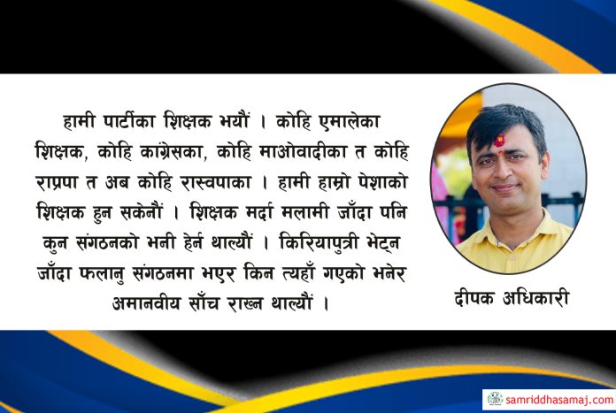 अझ कुनै शिक्षक संगठन त विधानतः कुनै राजनीतिक पार्टीको भातृ संगठन होइन तर कार्यक्रमहरुमा पार्टी कै नेता ल्याएको पाउँछौं । जसका कारण धेरै शिक्षकहरु जो भोट हाल्दा फरक पार्टीलाई हाले पनि तटस्थ संस्था हो भनेर संगठित शिक्षक साथीहरुमा वास्तविकता फरक अनुभूति छ । पछिल्ला समयमा त झन् संगठनहरुमा खुलेआम पार्टी नै मिसायौं । यस्तै पार्टीगत लिगेसी र व्यानरहरुमा हरेक संगठनका पार्टीगत उपस्थितिका कारणले हाम्रो पेशा नै बदनाम भयो । हामी पार्टीका शिक्षक भयौं । कोहि एमालेका शिक्षक, कोहि कांग्रेसका, कोहि माओवादीका त कोहि राप्रपा त अब कोहि रास्वपाका । हामी हाम्रो पेशाको शिक्षक हुन सकेनौं । शिक्षक मर्दा मलामी जाँदा पनि कुन संगठनको भनी हेर्न थाल्यौं । किरियापुत्री भेट्न जाँदा फलानु संगठनमा भएर किन त्यहाँ गएको भनेर अमानवीय सोँच राख्न थाल्यौं । हाम्रा पहुँचले कुनै शिक्षकको सरुवा गर्दा वा अस्थायी रुपमा शिक्षकहरु नियुक्ती गर्दा वा नयाँ नियुक्त शिक्षकलाई हाजिरी गराउँदा सांगठनिक आवद्धता, पार्टीगत आवद्धता खोज्न थाल्यौं । जसले शिक्षकको नै परिभाषा व्यवहारिक रुपमा कमजोर बनाउन थाल्यौं ।