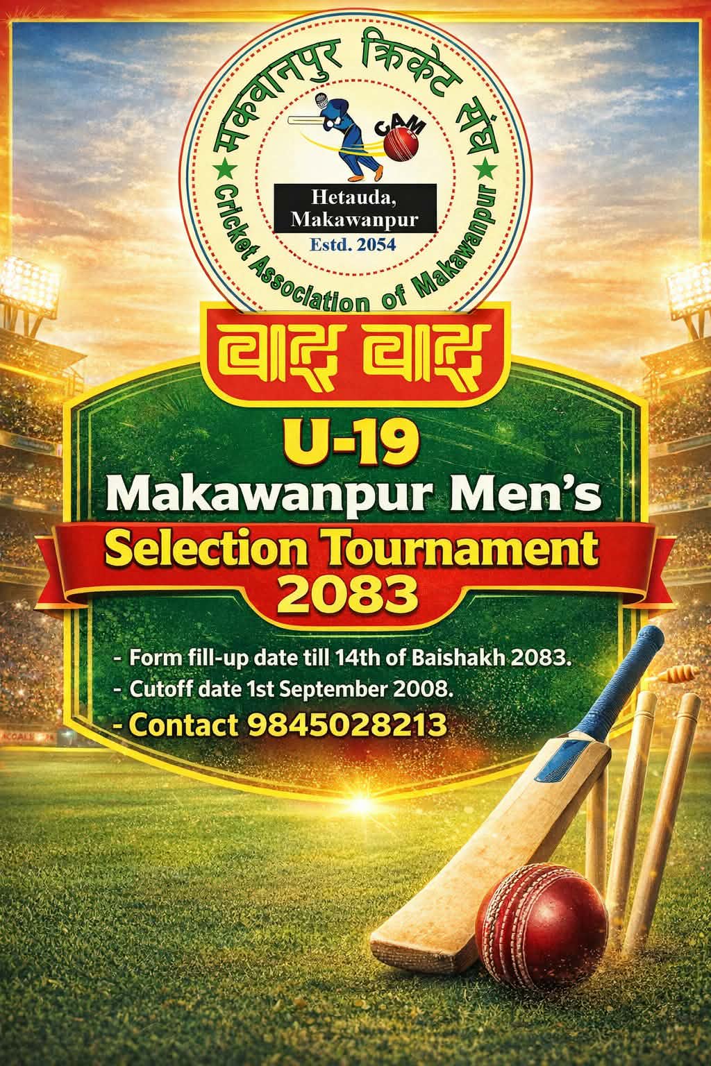 हेटौँडाः मकवानपुर क्रिकेट संघले वाइवाइ यु–१९ पुरुष एकदिवसीय क्रिकेट प्रतियोगिता २०८३ का लागि जिल्लास्तरीय खेलाडी छनोट गर्न आह्वान गरेको छ । संघले सोमबार एक सूचना जारी गर्दै छनोट प्रतियोगितामा सहभागी हुन इच्छुक खेलाडीहरूका लागि दर्ता फर्म खुला गरेको हो ।