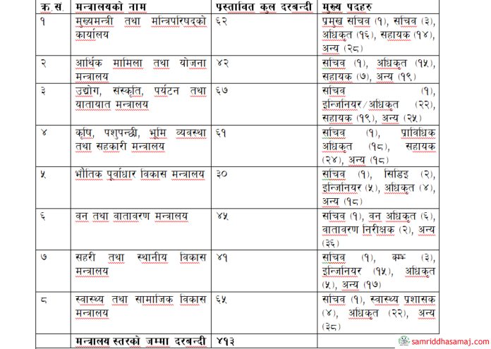 मन्त्रालयहरुमा दरबन्दी कटौति गरेर प्रस्तावित नयाँ दरबन्दी ।