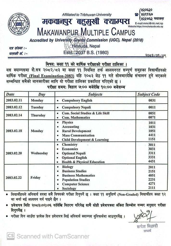 हेटौँडा : हेटौँडा-२ स्थित मकवानपुर बहुमुखी क्याम्पसले कक्षा ११ को वार्षिक परीक्षाको तालिका सार्वजनिक गरेको छ । शैक्षिक सत्र २०८२/८३ मा कक्षा ११ नियमिततर्फ अध्ययनरत सम्पूर्ण समूहका विद्यार्थीहरुका लागि क्याम्पसले बुधबार परीक्षा तालिका सार्वजनिक गरेको हो ।