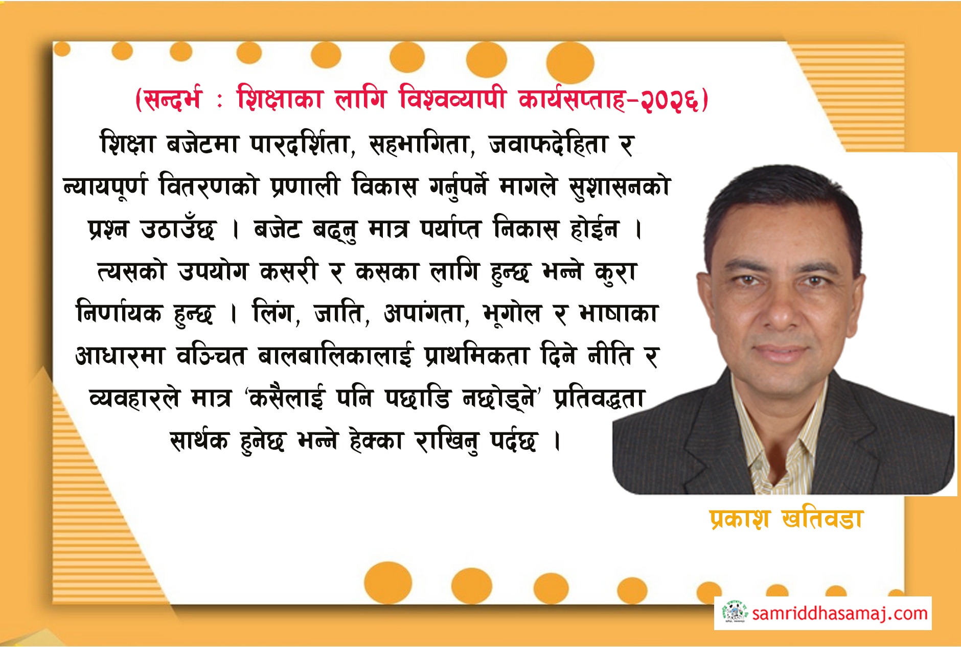 ‘शिक्षामा पर्याप्त लगानीका लागि अभियानको ज्योति बालिराखौं’ भन्ने नाराका साथ विश्वभरीनै शिक्षाका लागि विश्वव्यापी कार्यसप्ताह सुरु भएको छ । नेपालमा शिक्षाका लागि राष्ट्रिय अभियान नेपालले यसलाई नेतृत्वदायी भूमिका निर्वाह गरेको छ । यो कार्यसप्ताह हरेक वर्ष विश्वभर शिक्षा अधिकारका पक्षधरहरू सहकार्य गर्दै एक स्वरमा बुलन्द गरी उठाइने नागरिक आवाज हो । यस अभियानलाई विश्व नागरिक समाज सञ्जाल ‘ग्लोबल क्याम्पेन फर एजुकेशन’ले समन्वय गर्दै आएको छ । शिक्षाका लागि विश्वव्यापी कार्यसप्ताह–२०२६ ले अघि सारेको सन्देशले शिक्षामा पर्याप्त, दिगो र न्यायोचित लगानीको आवश्यकताको औचित्य पुष्टि गरेको छ ।