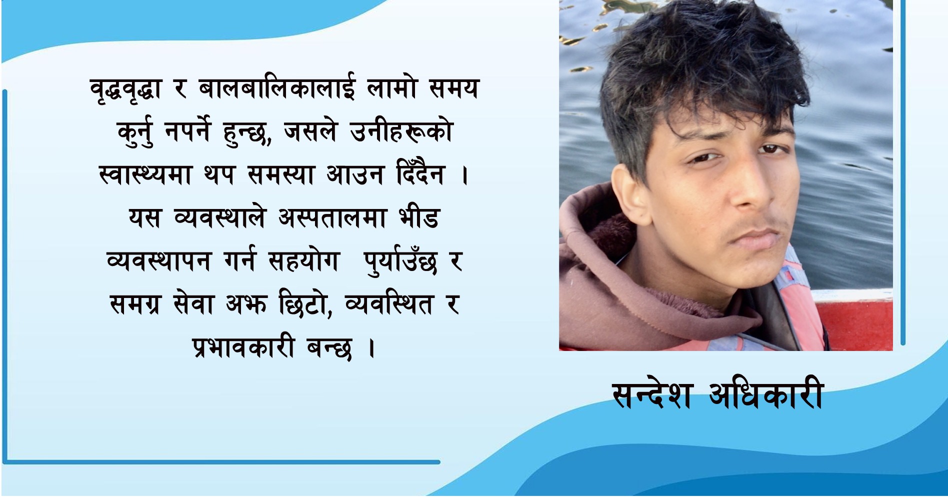 ‘स्वास्थ्य नै धन हो’ भन्ने उक्ति निकै सत्य छ । मानिस स्वस्थ भए मात्र उसले आफ्नो जीवन सुखी र सफल बनाउन सक्छ । त्यसैले गुणस्तरीय स्वास्थ्य सेवा प्रत्येक नागरिकको आधारभूत आवश्यकता हो । हेटौँडा सरकारी अस्पतालमा बिरामीको चाप धेरै हुने भएकाले सेवा लिन कठिनाइ हुन्छ । सबैभन्दा पहिले कुपन लिन बिहानैदेखि लामो लाइन बस्नुपर्ने समस्या छ । यसलाई व्यवस्थापन गर्नका लागि वृद्धवृद्धा, महिला, बालबालिका र १८ वर्षभन्दा माथिका पुरुषका लागि छुट्टाछुट्टै चार लाइन बनाउनु आवश्यक छ । यसले भीड नियन्त्रण गर्न र सबैलाई सहज सेवा दिन मद्दत गर्दछ ।