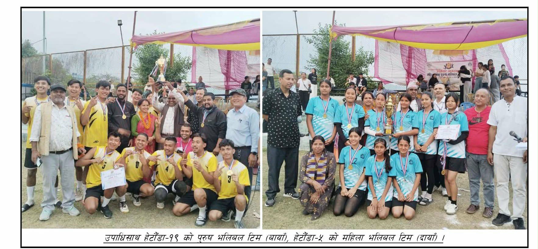 हेटौँडाः आठौँ संस्करणको वडास्तरीय उपमेयर कप महिला तथा पुरुष भलिबल प्रतियोगिता सम्पन्न भएको छ । मंगलबार सम्पन्न भएको प्रतियोगिताको उपाधि महिलातर्फ हेटौँडा–५ र पुरुषतर्फ हेटौँडा–१९ ले उचालेको छ ।