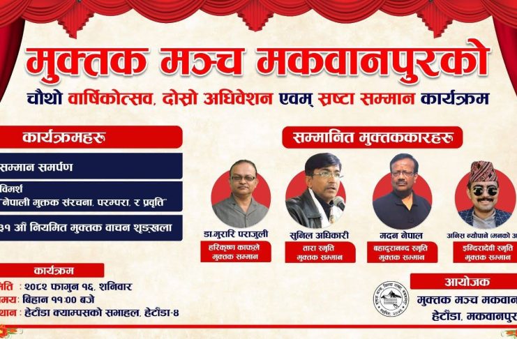 हेटौँडा : अन्तर्राष्ट्रिय श्रमिक महिला दिवसको अवसरमा आईतबार मकवानपुरमा कविता प्रतियोगिता हुँदैछ । जिल्ला बचत तथा ऋण सहकारी संघ लिमिटेड मकवानपुरको आयोजनामा प्रतियोगिता हुन...